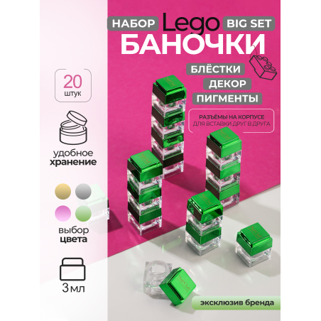 Быстрый просмотр 700,00 ₽ 5% 35,00 ₽ Набор баночек с крышкой пустые "ЛЕГО" зеленые 20 шт В корзину Новое