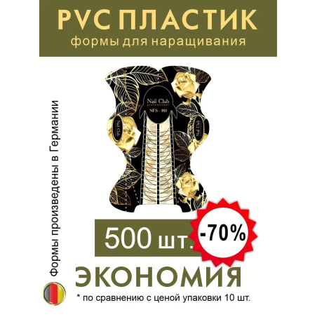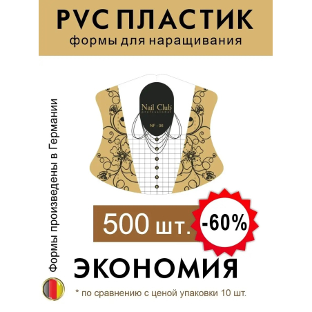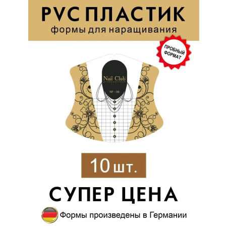 Формы для ногтей из облегчённого PVC-пластика от немецкого производителя Nail Club professional выпускаются с 2017 года. Всего в ассортименте бренда 5 видов пластиковых форм — они отличаются дизайном, выкройкой, разметкой, длиной и прочей атрибутикой.