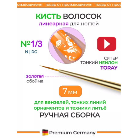 Кисть из упругого бронзового нейлона. Супертонкая. Длина ворса 10 мм. Используется для прорисовок гель-красками и пастами – вензелей, барельефов, орнаментов, и др. Максимальная точность и скорость. Упругая кисть. Удерживает каплю на кончике ворса.